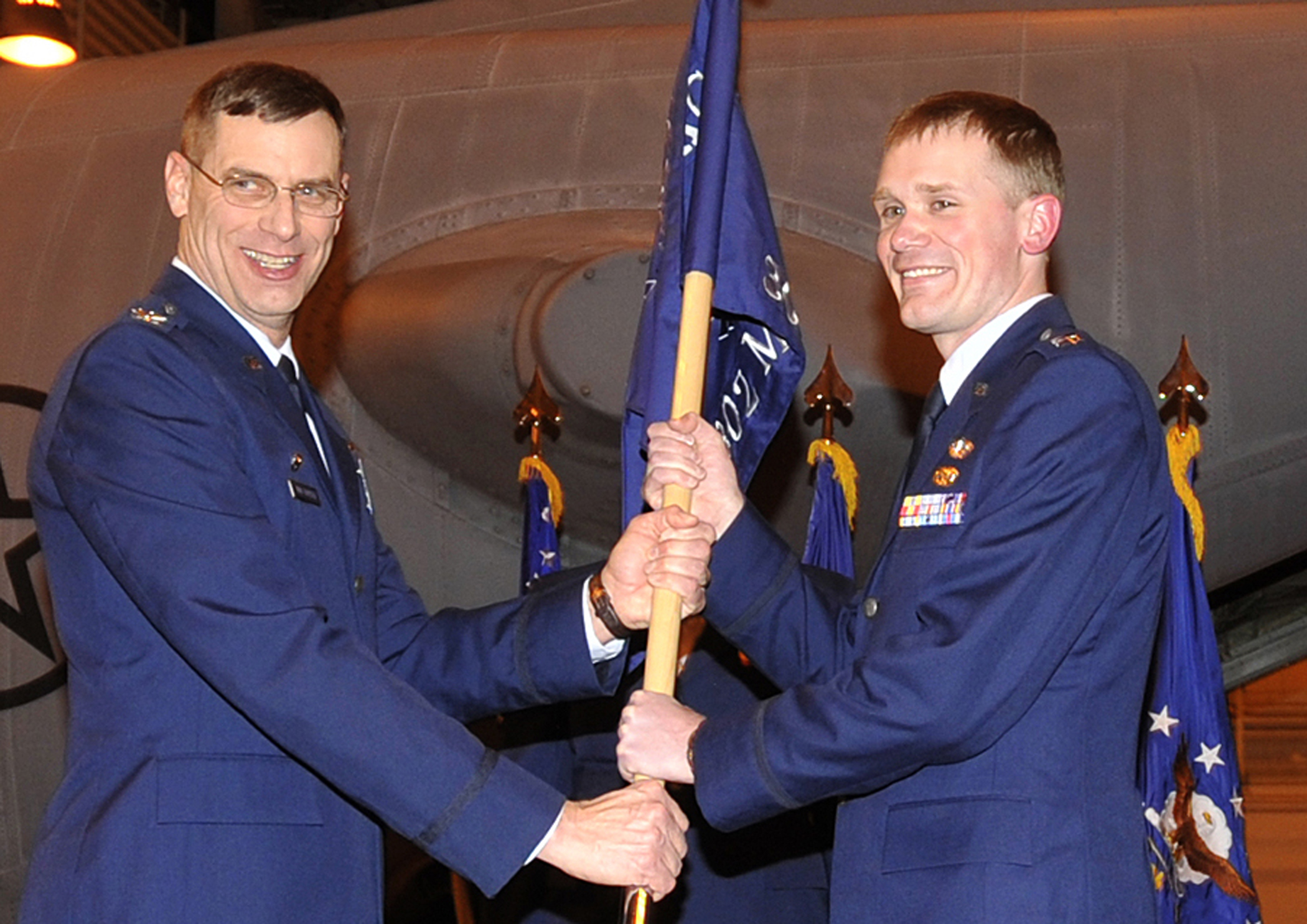 Col. James Van Housen, commander, 302nd Airlift Wing Maintenance Group, left, hands the 302nd AW Maintenance Operations Flight guidon to Capt. Ryan Webster during a ceremony April 2 at Peterson Air Force Base, Colo. Capt. Webster assumed command from Maj. Mary Carrion, who retired during the ceremony. (U.S. Air Force photo/Dennis Howk)