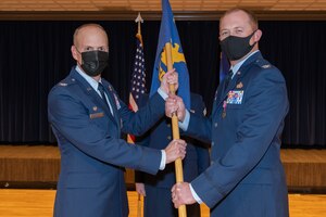 Col. Christopher Zidek, 302nd Airlift Wig commander, presents the 302nd Mission Support Group guidon to Col. Alexander Logan, the new 302 MSG commander, during a change of command ceremony, Feb. 5, 2022, at Peterson Space Force Base, Colorado. As the 302 MSG commander, Logan is responsible for the