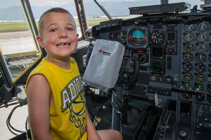 Noah Harder, son of Chaplain (Maj.) Todd Harder, 302nd Airlift Wing, sits in the flight deck of a C-130 Hercules aircraft during the 302nd AW’s Family Day, Aug. 4, 2018, at Peterson Air Force Base, Colorado. (U.S. Air Force photo by Staff Sgt. Amber Sorsek)