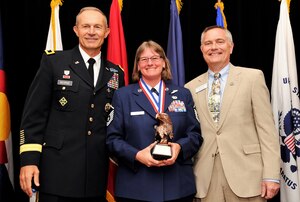 Master Sgt. Jeanette Rummel, a 731st Airlift Squadron evaluator flight engineer, poses for a photo with U.S. Army Maj. Gen. Randy George, the 4th Infantry Division commander, left, and Mark Seglem, the regional vice president of Colorado Campuses, right, during the 2018 Armed Forces Luncheon, in
