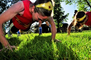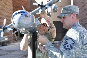 Tech. Sgt. Ryan Goode, left, and Master Sgt. Shane Sturgeon, both 302nd Maintenance Squadron aircraft maintenance technicians secure a newly refurbished model C-130 Hercules to the display stand of the SUMIT 38 memorial outside Building 890 here, May 22, 2017. The display, which was destroyed by