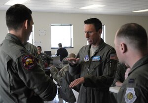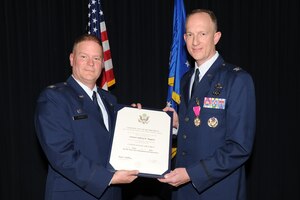 Col. Robert Stanton, left, the 302nd Operations Group commander, passes the 302nd Operations Support Squadron guidon to Lt. Col. Ryan Tanton, right, who assumed command of the squadron during a change of command ceremony, April 1, 2017, at Peterson Air Force Base, Colo. Tanton takes command of the