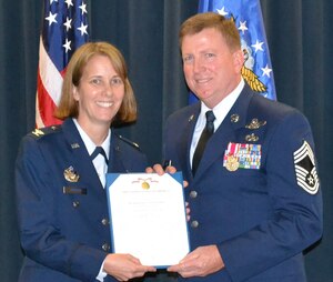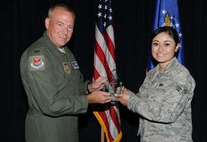 PETERSON AIR FORCE BASE, Colo.— Senior Airman Kaila Paul (right), a 302nd Airlift Wing Reservist assigned to the 302nd Security Forces Squadron, was awarded the 302nd AW Airman of the Second Quarter Award, 2016, by Col. Robert Stanton Aug. 7, 2016 here. Stanton, 302nd Operations Group commander,