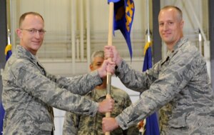 PETERSON AIR FORCE BASE, Colo. – Col. Jeffrey Higgins, left, 302nd Maintenance Group commander, passes the guidon to Maj. Michael Loney as he assumes command of the 302nd Maintenance Squadron in a ceremony July 16, 2016 here. During the ceremony Higgins lauded the squadron’s performance during their